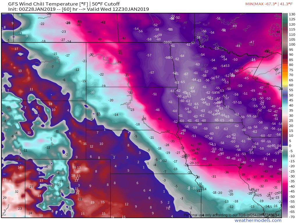 Skies clear out Wednesday night as high pressure builds in, ushering in much colder air. While it won’t be quite as cold as last Monday when most of the area had high temperatures around 5 degrees, we’ll have more wind this time, so wind chills will be well below zero on Thursday. So, how could it be worse? When this airmass moves into the Northern Plains and Upper Midwest later Tuesday into Wednesday, temperatures will be a LOT colder. Across parts of the Dakotas and Minnesota, low temperatures will drop near or below -40 Thursday morning, with afternoon highs not reaching -30 in some areas. This is actual air temperature, not wind chill. So what will the wind chills be? How does -60 to -65 sound? We’re not quite sure why people voluntarily live in this area, but they do.