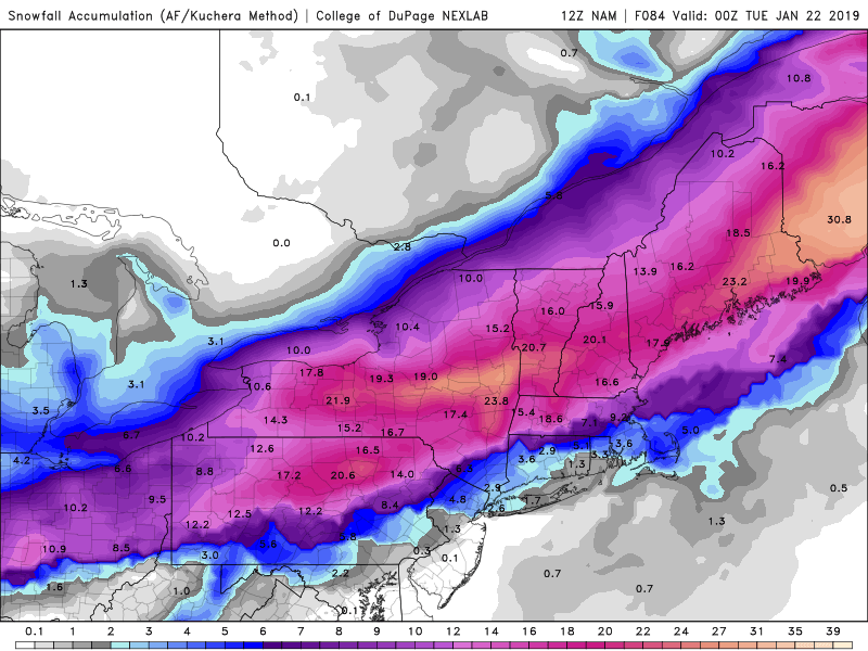 The week starts off with high pressure building in, giving us sunshine and seasonably cold conditions. Clouds will start to move in during the evening as low pressure heads towards the Midwest. As this system moves across the Great Lakes on Tuesday, snow will develop across the region Tuesday afternoon. A secondary area of low pressure will develop across the Mid-Atlantic states during the afternoon. This will help bring milder air into the region, changing to snow to rain during the afternoon and evening hours. Whether or not this changeover makes it into southern and central NH is still a question mark. Either way, this doesn’t look like a big snow producer, with a few inches across central and southern NH, and an inch or less elsewhere.