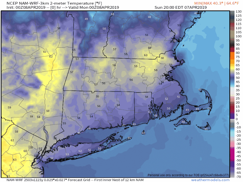 Monday: Cloudy and cool with periods of rain and showers, along with some fog and drizzle. High 43-50 north of the Mass Pike, 51-58 south of the Pike.