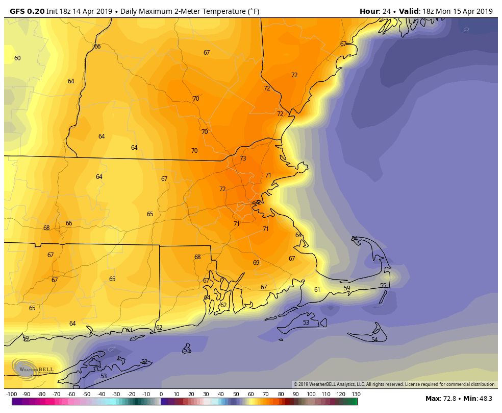 The week starts off on a damp but mild note as warm front lifts northward during the morning. Showers and maybe even some thunderstorms are likely. This system has been producing severe weather across much of the eastern half of the nation for the past few days, but we’re not expecting any severe weather here. Some downpours, gusty winds, and a little lightning are expected, but nothing severe. The rain should end around 9-10am, which is perfect timing for both the Marathon and the Red Sox game. Some sunny breaks could develop in the afternoon, which may allow temperatures to get up to 70 once again. The mild weather comes to an end late this afternoon as a cold front moves through, likely with a few more showers.