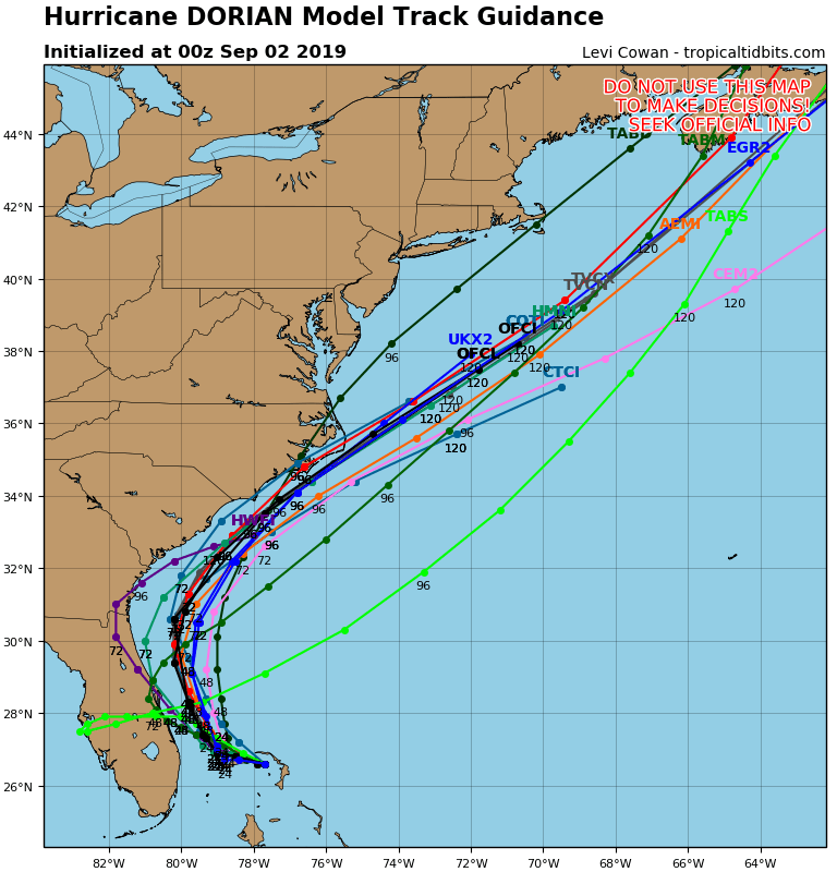 Model forecasts for the track of Hurricane Dorian. Image provided by Tropical Tidbits.