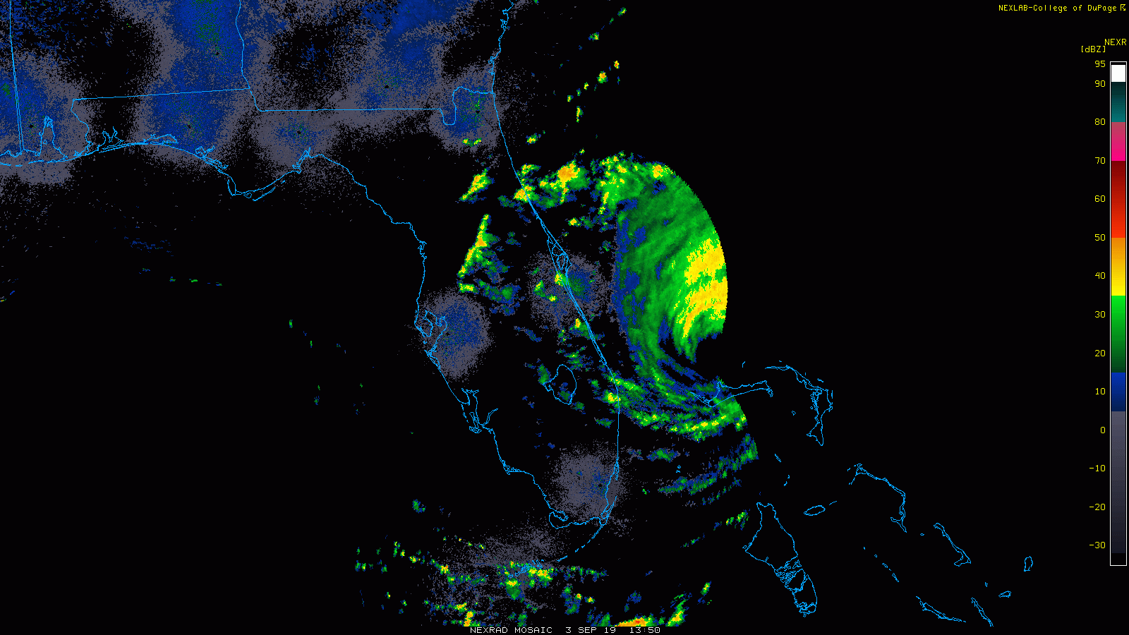 Dorian’s eye shows up rather nicely on radar from Florida this afternoon. Loop provided by the College of DuPage.