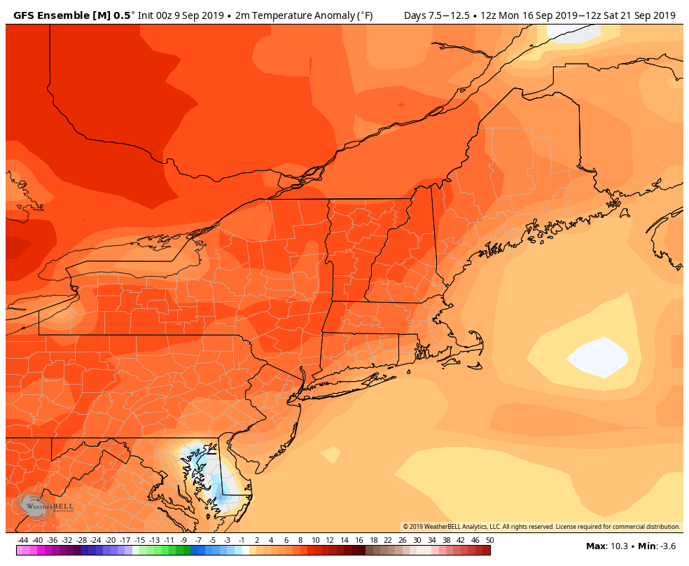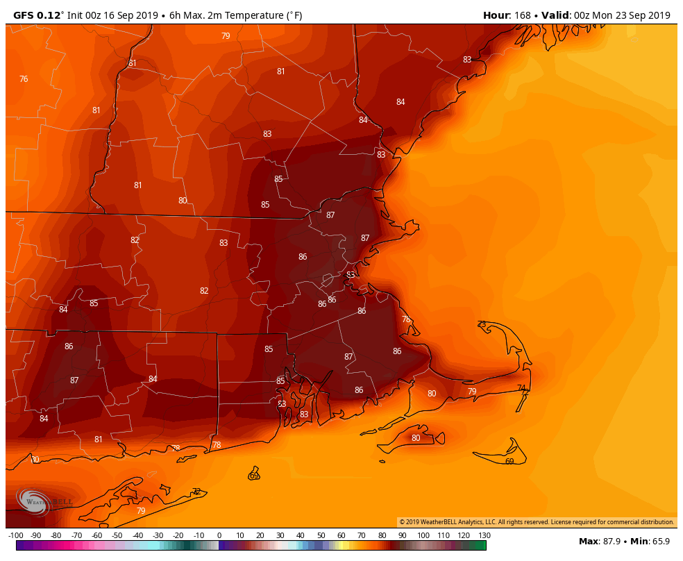 Sunday is the last day of (astronomical) summer, and the GFS thinks it’ll be a warm one. Image provided by WeatherBell.