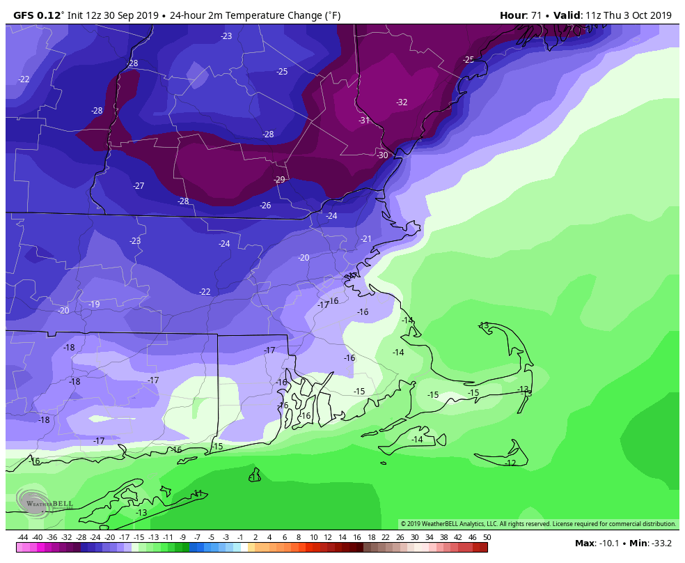 Temperatures Thursday morning will be 20-30 degrees cooler than Wednesday morning behind a strong cold front. Image provided by WeatherBell.