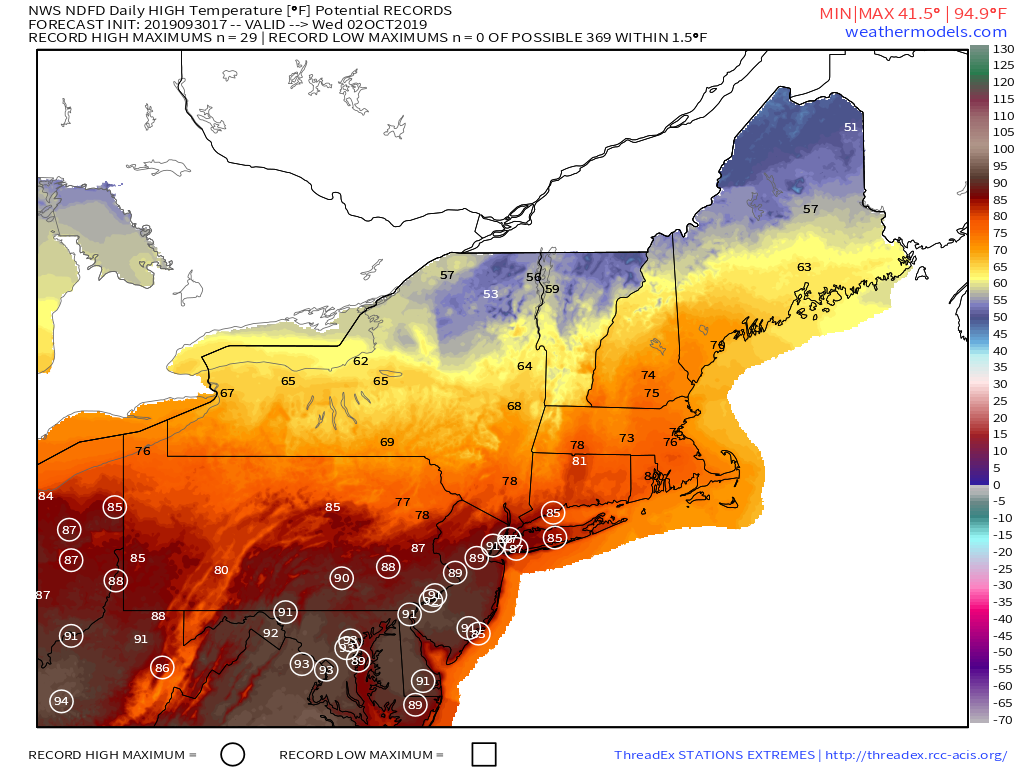 Looks like any record high temperatures on Wednesday will be confined to New York City and points south and west, as the front will probably come through a little too early around here. Image provided by Weathermodels.com