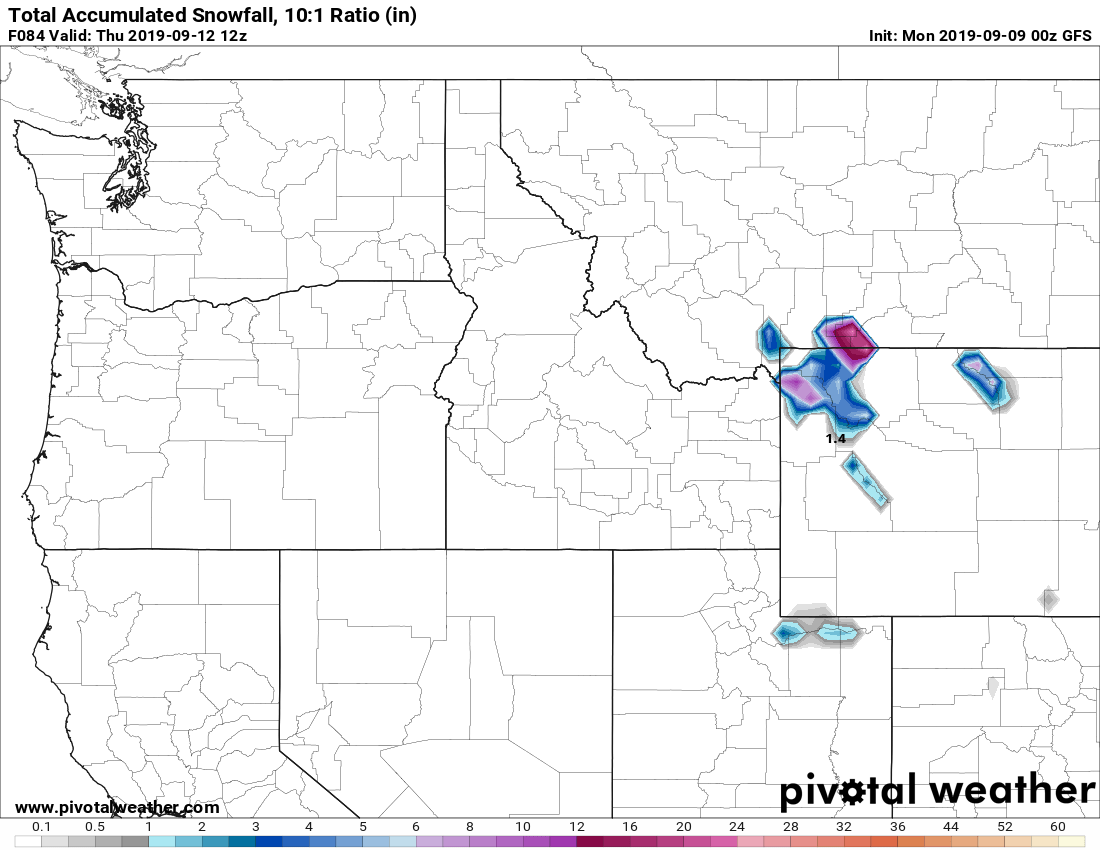 It’s getting to be that time of year. Some higher elevation snow is possible in parts of Wyoming and Montana on Wednesday. Image provided by Pivotal Weather.