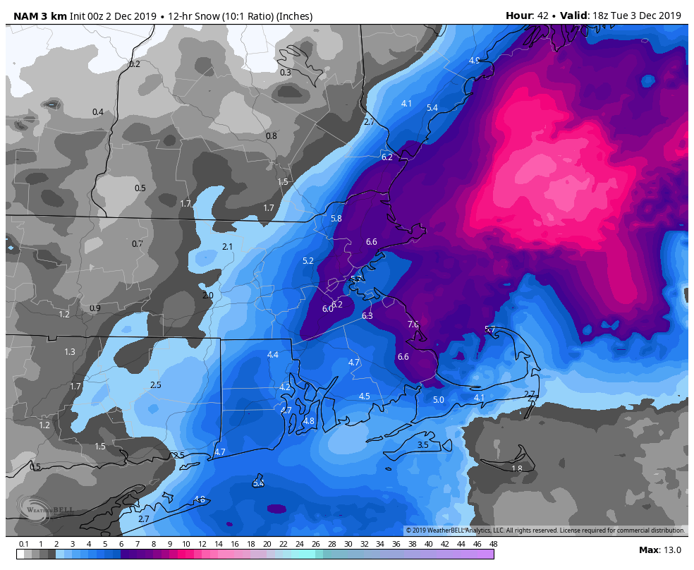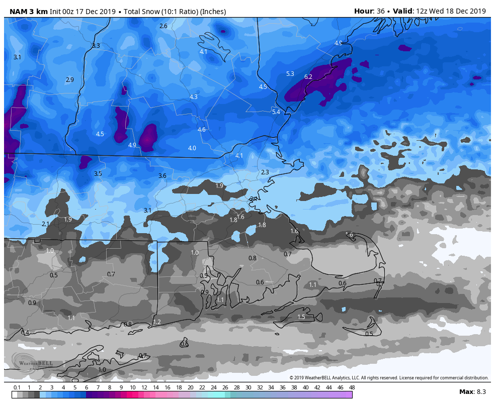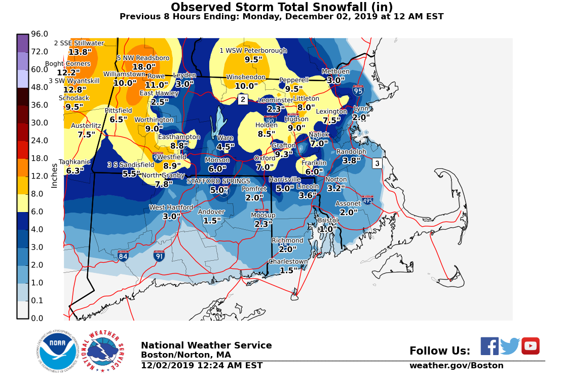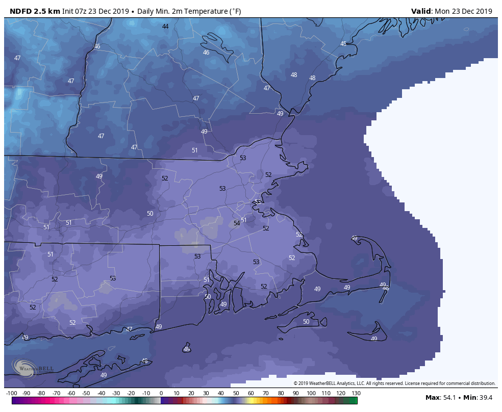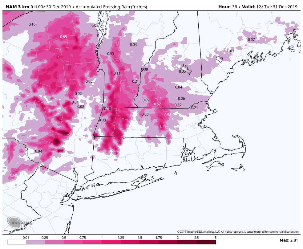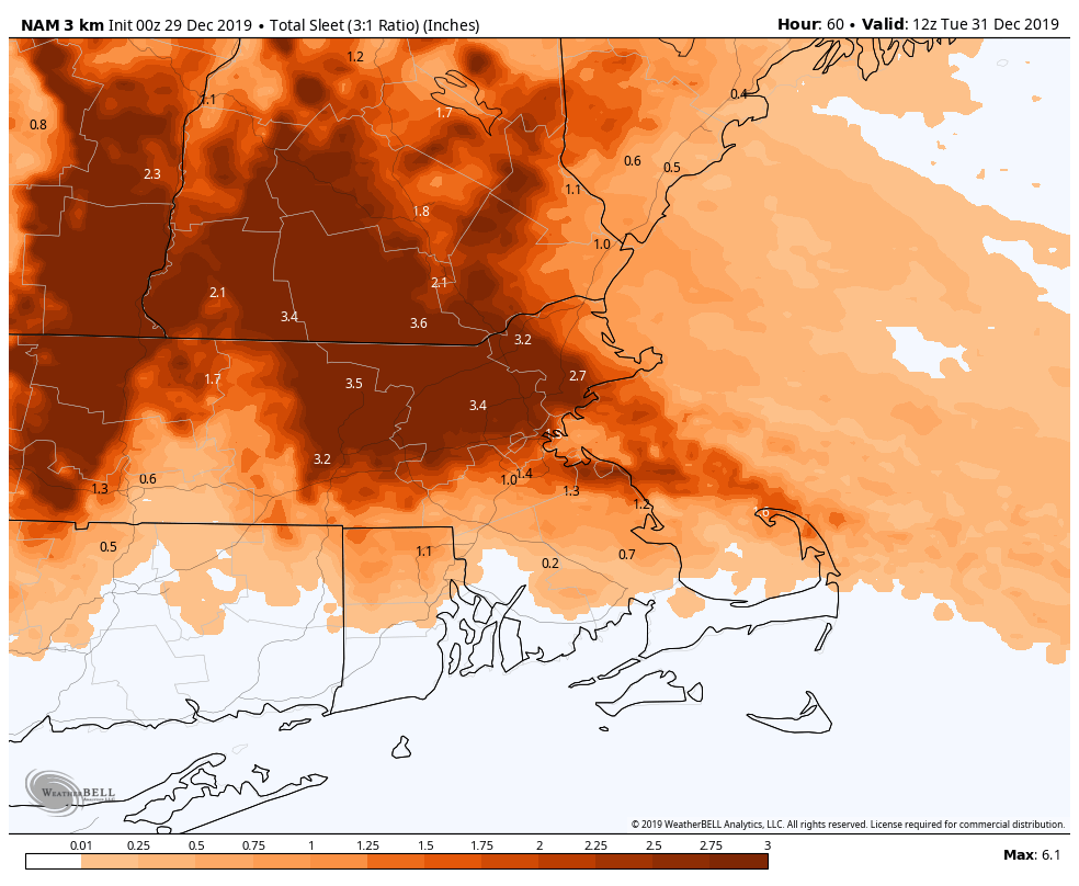 Monday: Breezy with sleet and freezing rain across the interior, rain along the coast. Sleet accumulations of an inch or two are possible across the Merrimack Valley and southern Hampshire, while up to 1/2″ of ice accretion is possible across the higher elevations of the Worcester Hills and the Monadnocks. High 30-37.