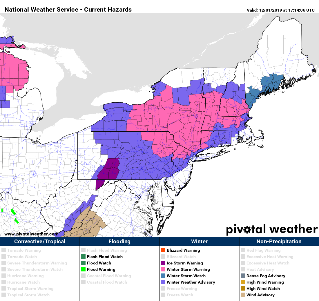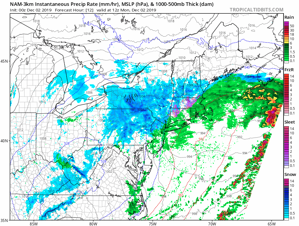 Low pressure will move into the Great Lakes today, with a frontal system extending eastward to the Mid-Atlantic coastline. This will keep us on the cold side, but warmer air will move in aloft. When you have warm air aloft, cold air below, and precipitation, you get sleet or freezing rain, depending on how thick the layers of warm and cold air are. For today, we’re looking at freezing rain across the higher elevations of Worcester County up into the Monadnocks, with a mix of sleet and some freezing rain from southern New Hampshire into the Merrimack Valley and interior portions of eastern Massachusetts. This will result in significant travel problems, not to mention the potential for tree and power line damage. For the rest of our area (mainly south and east of I-95), warmer air moving in off the ocean will keep temperatures above freezing, so it’ll be just another rainy, but chilly, Monday.