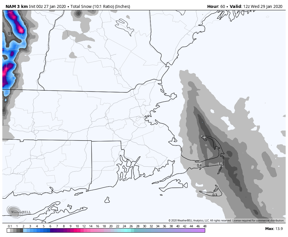 Tuesday: Partly sunny, except mostly cloudy across Cape Cod with some late-day snow showers possible. High 34-41.
