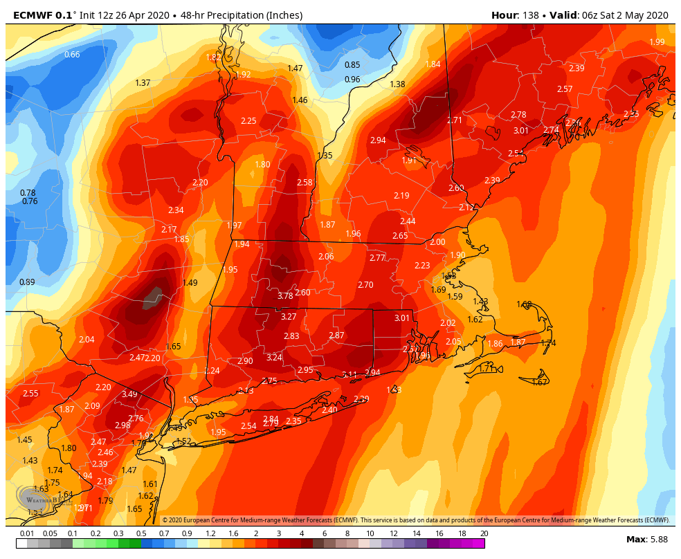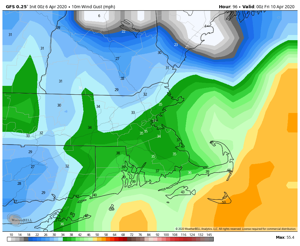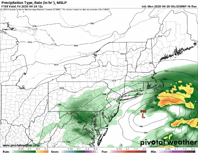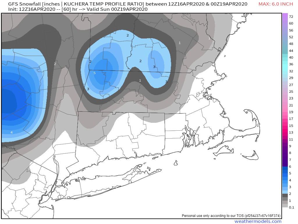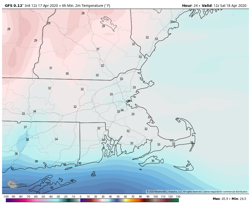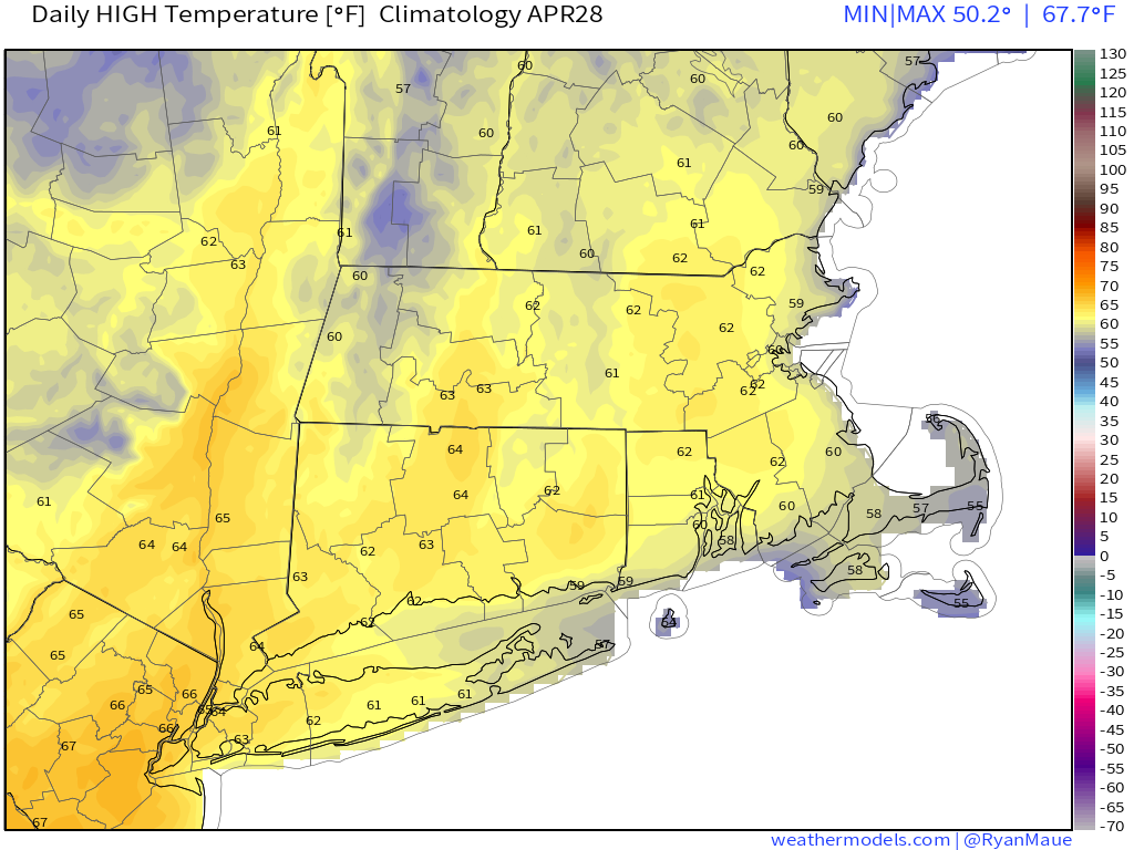 The week starts off with an absolutely miserable day on Monday. Low pressure will be meandering around south of New England, keeping us cloudy, cool, and rather wet, with occasional showers. Across the hills from Worcester County into the Monadnocks, there will likely be some flakes flying, especially in the morning and again late in the day. Temperatures will likely stay in the upper 30s and 40s all day today, which is 20-25 degrees below normal for late April. By Monday night the storm will start to slowly pull away, but things won’t improve that quickly. In fact, Monday night will be even more miserable, as the lingering showers may mix with or change over to wet snow across much of southern New Hampshire and eastern Massachusetts. There may be enough to coat the grass in some spots, but this shouldn’t be a big deal.