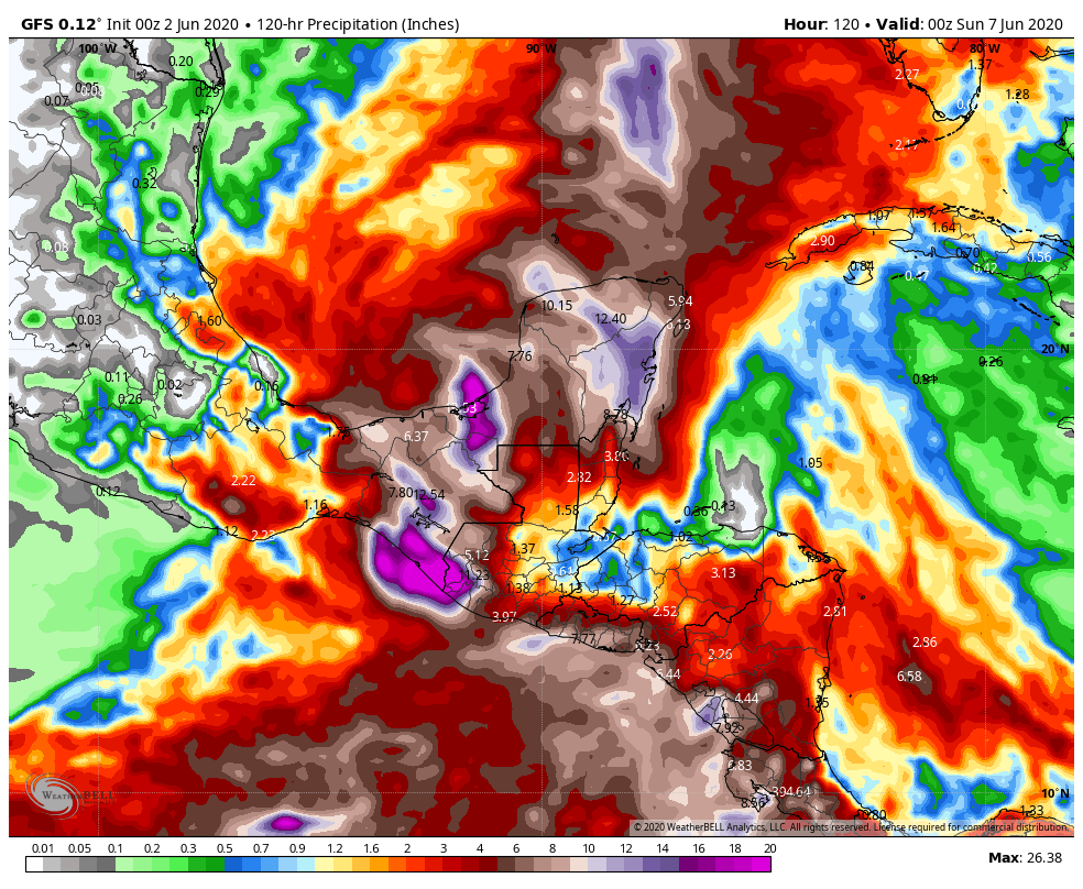 The forecast for the system is fairly straightforward for the next few days. The system should mill around in the Bay of Campeche, producing heavy rainfall across southeastern Mexico and neighboring countries, with some strengthening likely. This will produce significant flooding, and mudslides in mountainous areas. As we get into the latter half of the week, things gets significantly more complicated. There are two distinct scenarios presented by the various computer models at this time. The first option is that the system turns northward, and moves across the Gulf of Mexico, heading towards the northern Gulf Coast towards next weekend while strengthening. The second option is that the system moves into southeastern Mexico and dissipates, then a new storm forms near or north of the Yucatan Peninsula, and heads northward later in the week. Either way, residents of the Gulf Coast should pay attention to the progress of this system as as the week goes on.