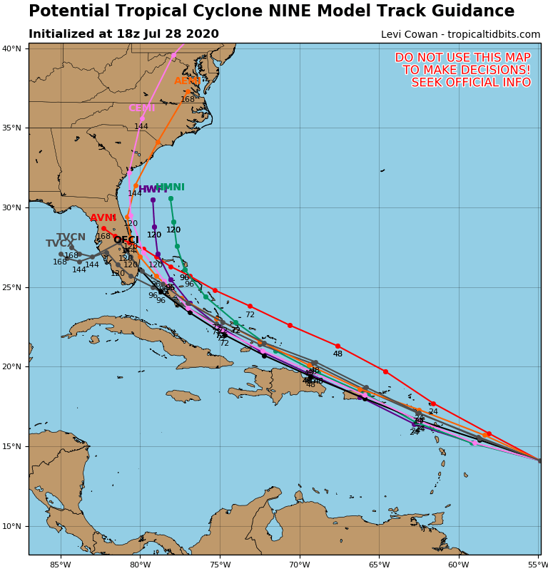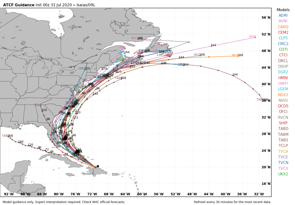 The short-term forecast for Isaias is rather simple. It will continue to move toward the northwest across the Bahamas while gradually slowing down. Waters remain very warm in this area (29-31C), and wind shear shouldn’t be that strong, which will allow Isaias to strengthen a bit more over the next day or two.
