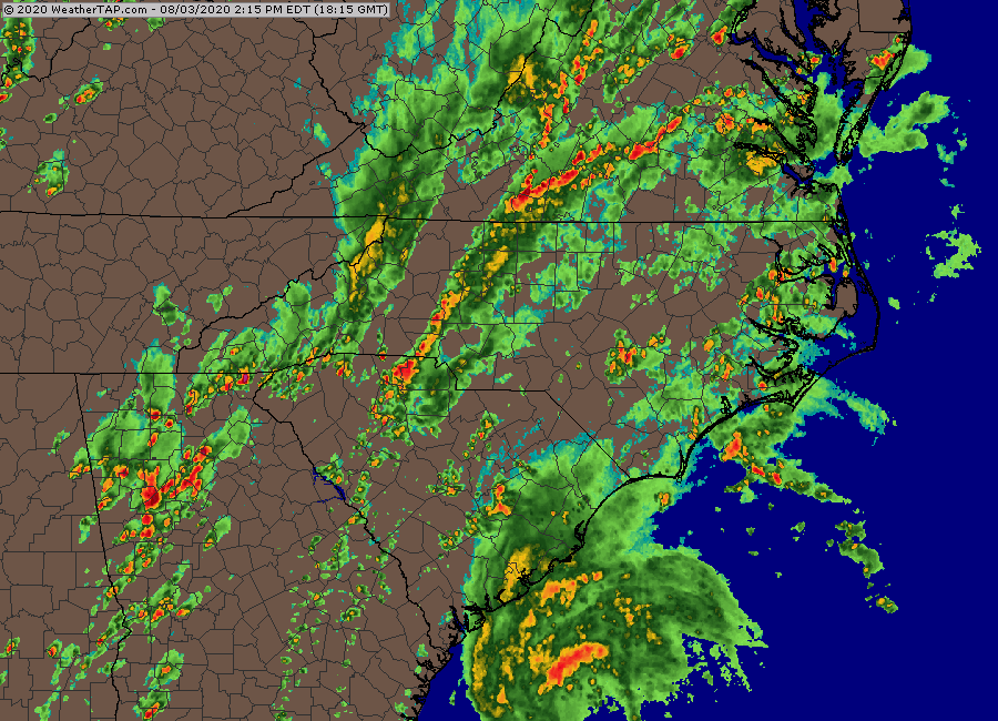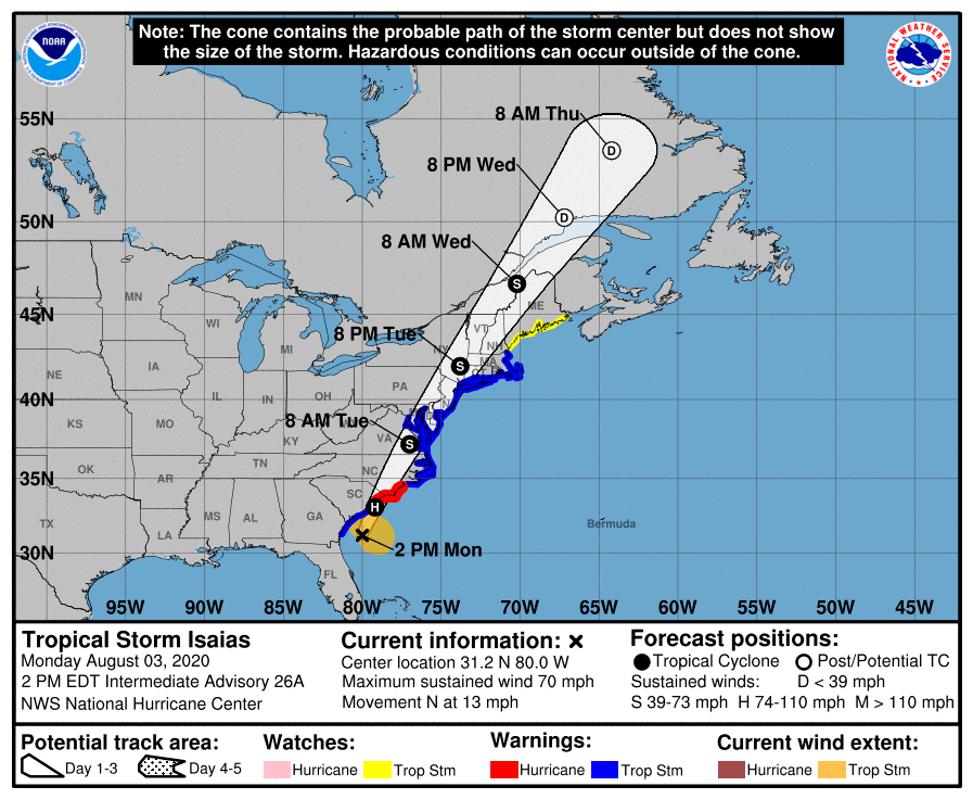 As of 2pm Monday, Tropical Storm Isaias was centered about 115 miles south of Charleston, South Carolina, moving toward the north at 13 mph, though radar and data from Air Force reconnaissance aircraft appear to show a motion more toward the north-northeast. The National Hurricane Center says maximum sustained winds are near 70 mph, but again, data from reconnaissance aircraft show the system to be weaker than that.