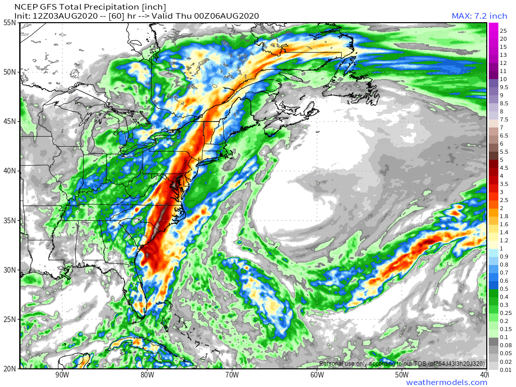 By far, the biggest threat with Isaias is heavy rainfall and the resulting flooding. The heaviest rain is likely along and west of the storm’s track. Rainfall totals of 3-6 inches and locally heavier are likely from the Carolinas into eastern Canada, which will produce flooding in many areas. The storm’s relatively quick motion will preclude even heavier totals. East of the storm’s track, rainfall will be much lighter, with many places likely seeing less than 1 inch, which won’t help with the drought developing across eastern New England.