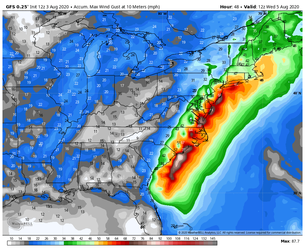 Isaias should continue heading north-northeastward, making landfall near the South Carolina/North Carolina border this evening. Although the official forecast calls for the storm to strengthen back into a hurricane before landfall, this appears unlikely at this point. There really isn’t much difference between a strong tropical storm and a weak hurricane anyway, so it’s a moot point. Once inland, it should continue on a north-northeast track, moving up the coastline, steered by an upper-level trough moving in from the west. Normally, tropical storms weaken rapidly as they move over land and away from warm water, which is their main source of energy. However, Isaias will be making the transition into an extratropical storm, so it may not weaken that rapidly.