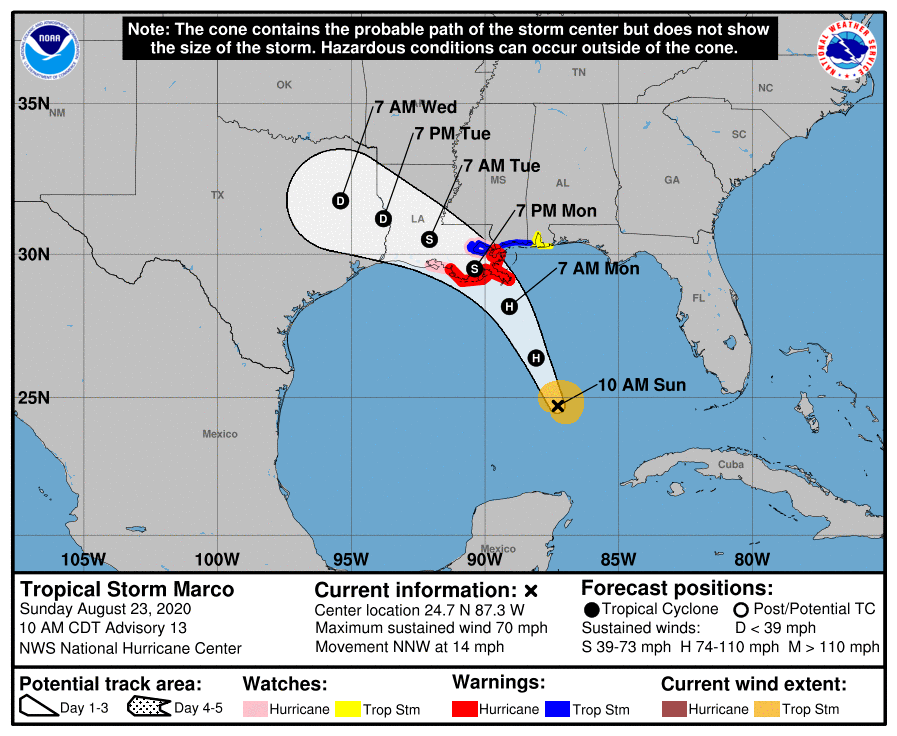 Tropical Storm Marco is the more immediate threat. As of 11am EDT Sunday, Marco was centered about 325 miles south-southeast of the mouth of the Mississippi River, moving toward the north-northwest at 14 mph. Maximum sustained winds were near 70 mph. Tropical Storm and Hurricane Watches and Warnings as well as Storm Surge Watches and Warnings are in effect for portions of the northern Gulf Coast.