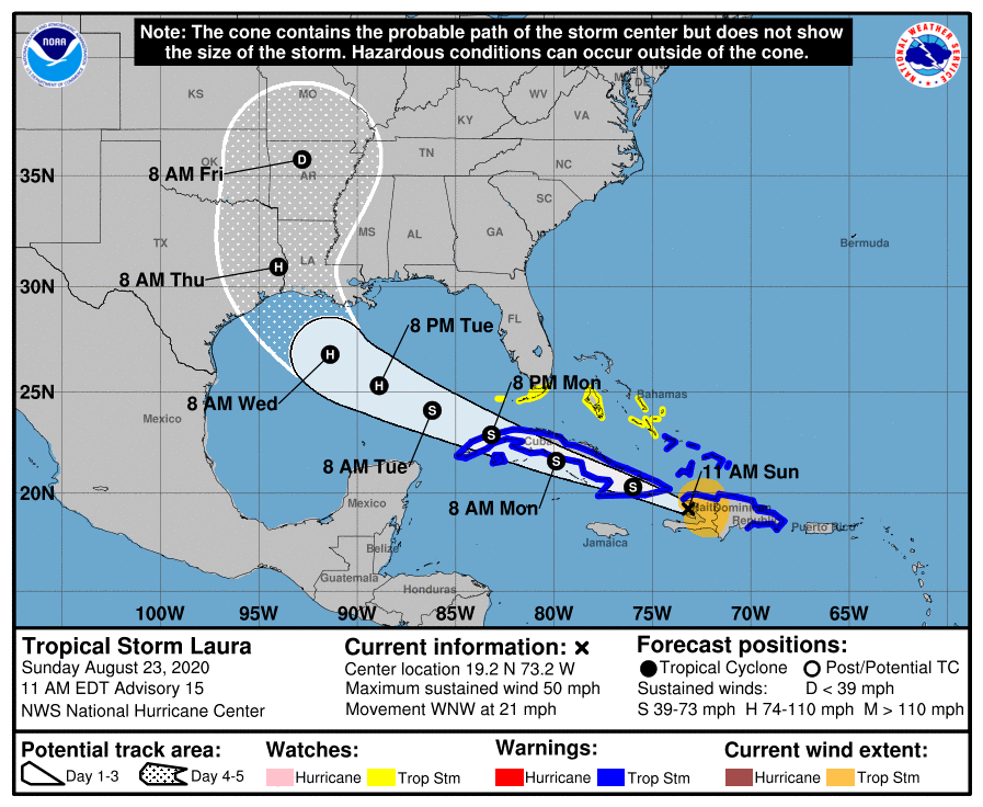 Marco is the initial threat, but Tropical Storm Laura is the more significant threat to the Gulf Coast. As of 11am EDT Sunday, Laura was centered about 95 miles southeast of the eastern tip of Cuba, moving toward the west-northwest at 21 mph. Maximum sustained winds were near 50 mph. Tropical Storm Warnings are in effect for parts of the Dominican Republic, Haiti, Cuba and the Southeastern Bahamas, with Tropical Storm Watches in effect for the Central Bahamas and the Florida Keys.