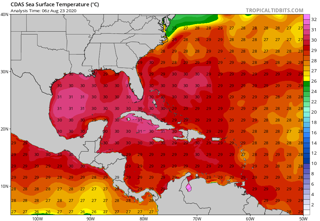 Laura is expected to move into the southeastern Gulf of Mexico Monday evening as a tropical storm. Once it does, it will find an environment that is favorable for strengthening. Water temperatures are well into the 80s, providing plenty of fuel for the system. (Tropical systems need water warmer than 80F/26C to survive and/or strengthen) A ridge of high pressure will also be building in aloft, resulting in very little wind shear. This is also an area that climatologically favors rapid intensification of tropical systems. Several models show the potential for Laura to quickly become a hurricane and possibly a major hurricane as it moves across the Gulf of Mexico on Tuesday. It should be noted that intensity forecasts for tropical systems, especially from forecast models, have been known to be rather poor.
