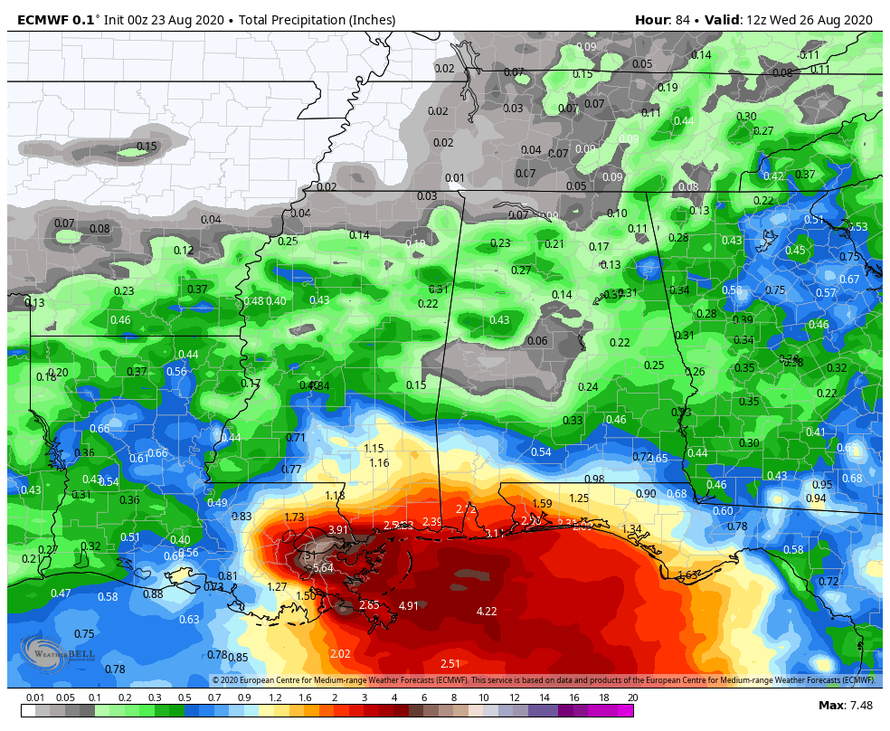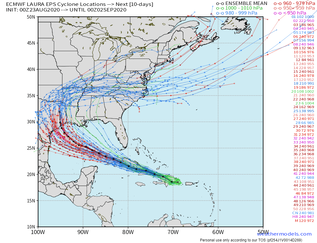 The track forecast for Laura is also a bit uncertain. The ridge of high pressure building in will help steer Laura more towards the west-northwest. How strong that ridge actually is will help determine how far west Laura moves. While the models were nearly unanimous just 24 hours ago that Laura was heading towards the Central Gulf Coast, they have shifted westward, putting parts of Texas and western Louisiana in the crosshairs. Additional shifts are likely over the next day or two as the models adjust to what is actually going on in the atmosphere. For now, residents of the Gulf Coast from Central Texas to Alabama should keep a close eye on Laura’s progress.