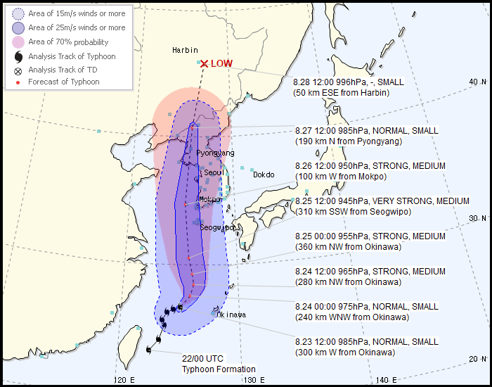 As of 11am EDT, Typhoon Bavi was centered about 600 miles south-southwest of the southwestern South Korea, moving toward the northeast at 9 mph. Maximum sustained winds were near 80 mph. Bavi is expected to turn more toward the north over the next 12-24 hours, with some additional strengthening expected. The current forecast calls for Bavi to move into the Yellow Sea, and pass just west of South Korea, before making landfall in extreme northwestern North Korea, then it will move into extreme northeastern China where it will rapidly weaken. Strong winds and storm surge flooding are likely across the Korean Peninsula over the next few days, with heavy rain likely causing flooding along the Peninsula as well as in northeastern China. Parts of this region have received heavy rain recently, and some flooding has already occurred, so this will exacerbate it in some areas.