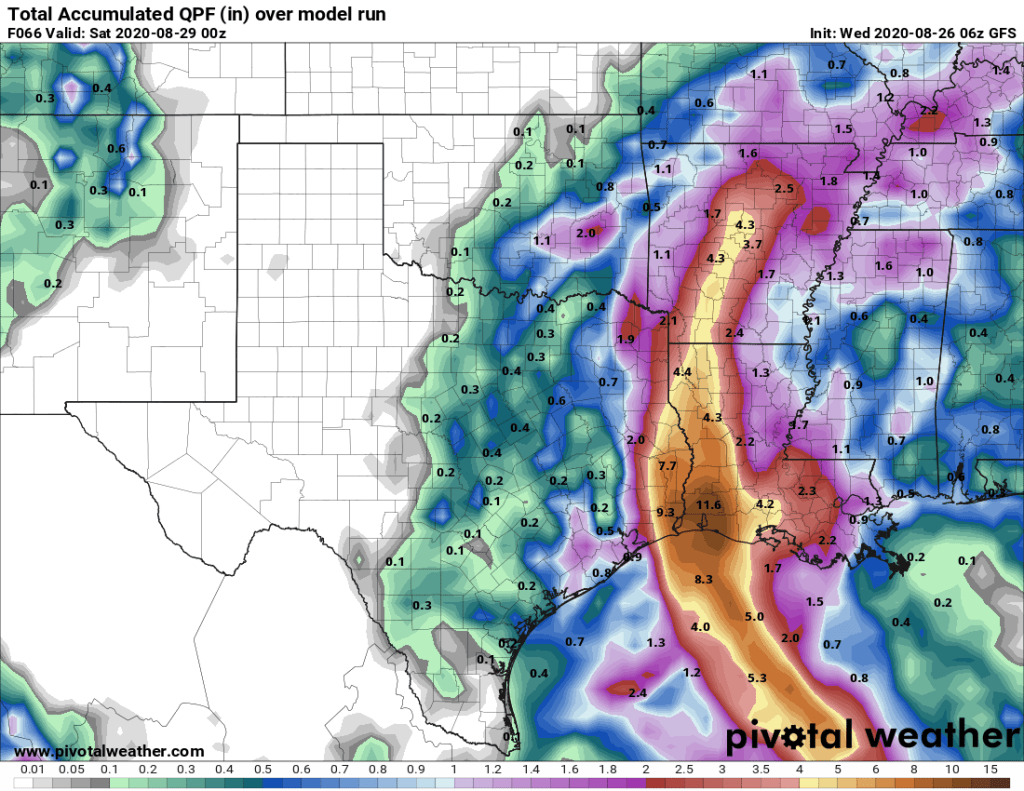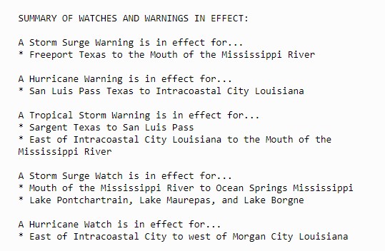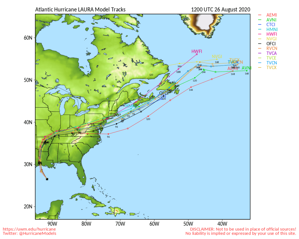 Laura presents many threats to the Gulf Coast. A storm surge of up to 15-20 feet will inundate coastal areas near and just to the east of where the center makes landfall. This will result in flooding across many of the bayous of southern Louisiana. Strong winds will obviously be a major hazard as well, mainly east of the center. The strong winds will likely penetrate well inland, as the storm will be powerful, though it should start to weaken fairly rapidly once inland.
