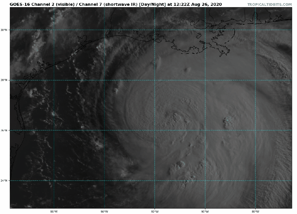 As of 11am EDT, Hurricane Laura was centered about 225 miles south-southeast of Lake Charles, Louisiana, moving toward the northwest at 16 mph. Maximum sustained winds have increased to near 125 mph, making Laura a Category 3 Hurricane. A buoy in the central Gulf of Mexico reported sustained winds of 76 mph and a gust to 107mph as the center of Laura passed nearby this morning. Hurricane and Storm Surge Warnings are in effect for portions of the Texas and Louisiana coastline, with Tropical Storm Warnings, Hurricane Watches, and Storm Surge Watches for areas adjacent to the warning areas.