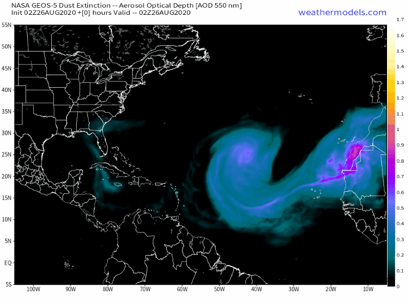 Once Laura moves inland, the Atlantic should remain quiet for the next week or so. Plumes of Saharan Dust continue to move off the west coast of Africa and traverse the Atlantic and Caribbean. The very dry air associated with these plumes inhibits thunderstorm development, which means they also prevent tropical systems from developing.