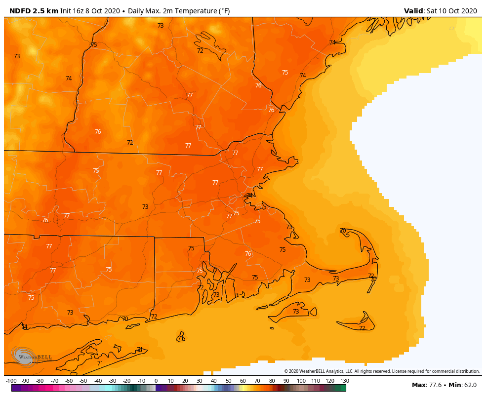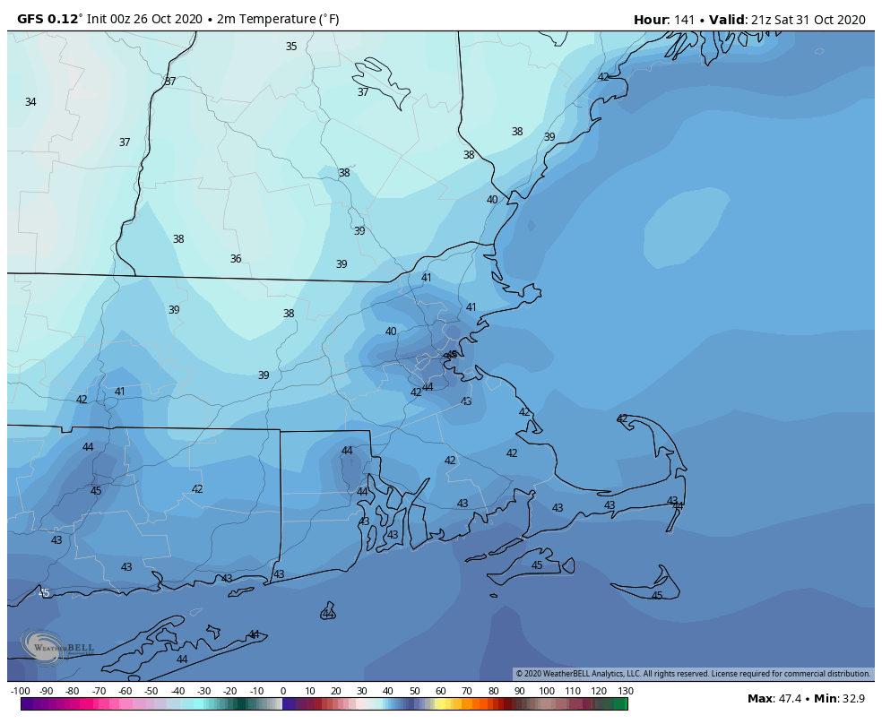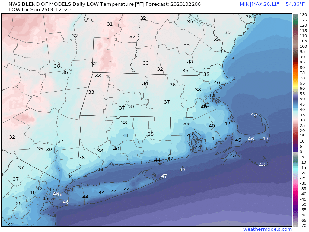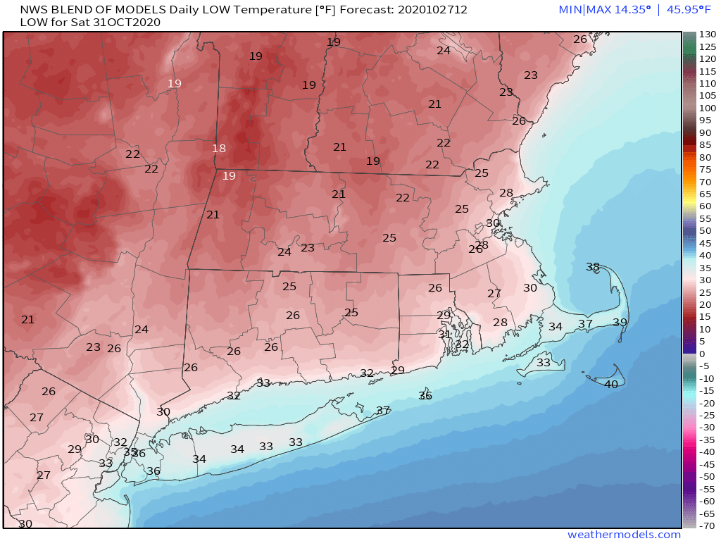 Friday night: Clear and chilly. Low 18-25, 26-33 across Cape Cod and the Islands.