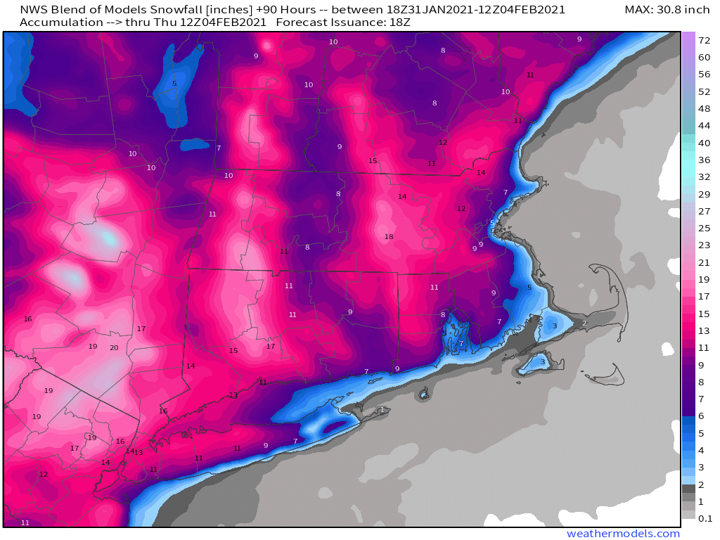 Areas North and West of Interstate-95 (including southern/Central NH): 10-15″ with some heavier amounts possible.