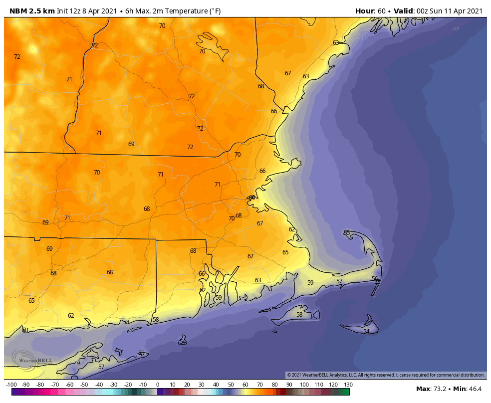 A wavy frontal boundary will be teasing us for the next several days while several waves of low pressure ride along it. South of that boundary, temperatures will be in the 70s and 80s, but north of it, only in the 50s and 60s. Unfortunately, that boundary is going to stay just to the south of our area for the most part. One wave rides along the front tonight, with periods of rain likely. The rain tapers off by Friday morning, and as the low pulls away. we may see some breaks of sunshine develop. As winds shift into the west and northwest behind the system, temperatures will actually warm up a bit, since the winds won’t be off the chilly Atlantic any longer. However, an upper-level low will be moving across the region, and it could help produce a few more showers Friday evening and night. With cooler air moving in, we could even see some wet snowflakes mix in, especially well inland and across some of the hills. High pressure will try to build in on Saturday with some sunshine along with gusty winds and cool temperatures.