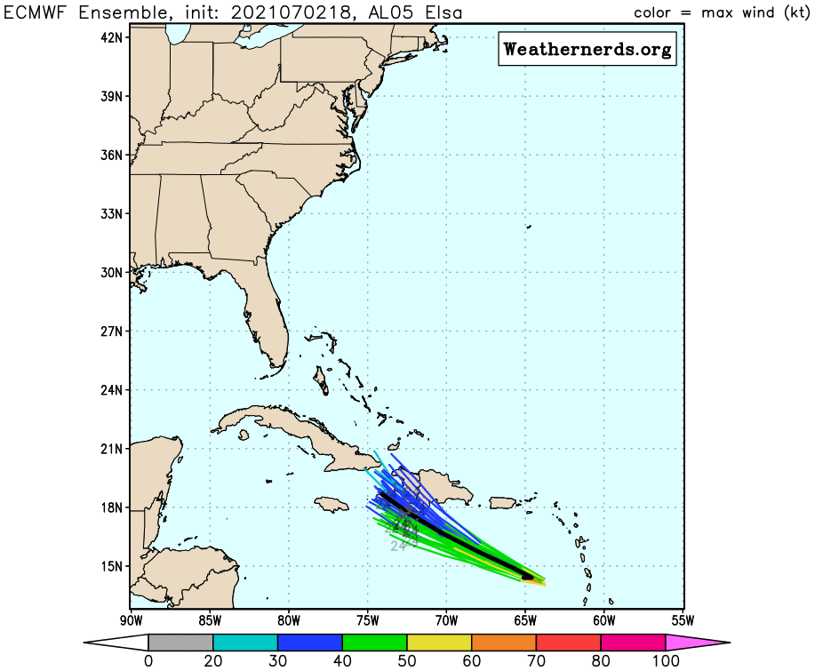 Elsa could strengthen a bit on Saturday, but for the most part, weakening is forecast. Some dry air got entrained in the circulation late Friday, okus the current rapid forward speed with both serve to inhibit any further strengthening, Although Elsa is expected to slow down over the next 24 hours, a turn more toward the northwest is expected. This will bring the storm closer to Hispaniola, where the mountainous terrain could disrupt the circulation as well.