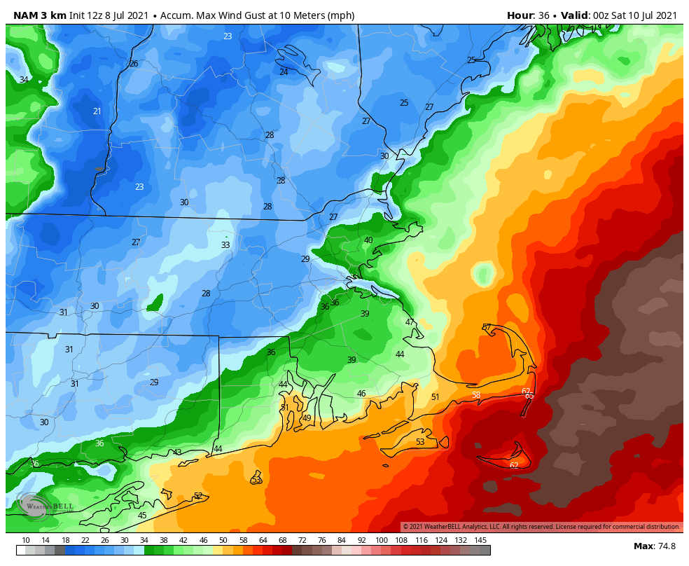 Tropical systems have different characteristics when they get up this way, compared to how they look in the Caribbean or Gulf of Mexico. They take on a “rain to the left, wind to the right” appearance. This means that the heavy rain shifts to the left side of the storms track, while most of the strong winds are to the right of the track. In this case, that means most of the wind will be confined to parts of southern RI, southeastern MA, and the offshore waters, but much of the rest of the region can expect heavy rain. How much rain? Rainfall totals of 2-4 inches and possibly heavier, most of it falling between about 8am and 2pm on Friday. Oh, an just to add to the fun for the folks in southern RI and southeastern MA, these systems can and usually do produce some short-lived weak tornadoes, mainly in the right-front quadrant of the storm.