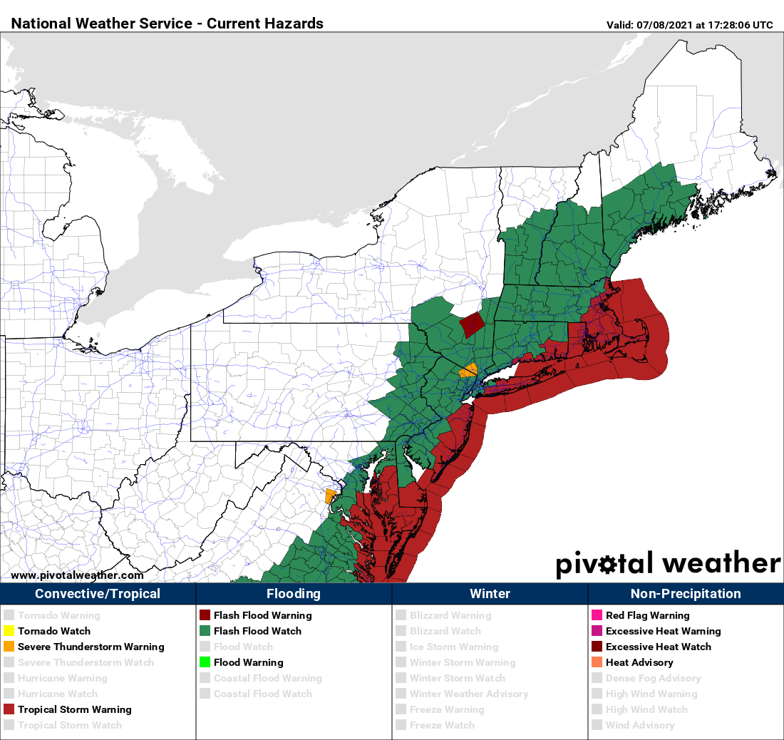 Before Elsa gets here, we’ll have some showers and thunderstorms to deal with this evening and tonight, thanks to a stalled out frontal system draped across the South Coast. Once Elsa’s rain moves out late Friday, high pressure will try to build back in on Saturday, but we’ll still have plenty of moisture around, which means we could pop a few showers and thunderstorms Saturday afternoon. Warm and humid air moves back in for Sunday and Monday (and into the middle of next week), with some showers and thunderstorms possible each afternoon, especially Monday.