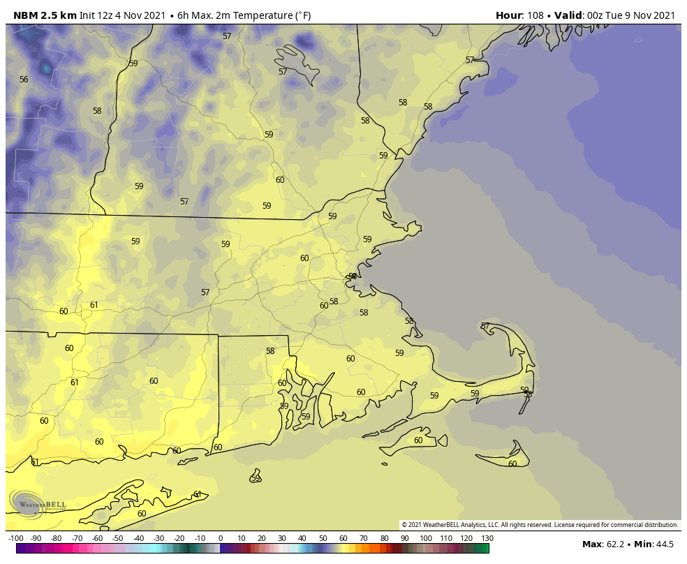 Tuesday: Some early sun, then clouds stream back in, slight chance for a shower or two near the South Coast. High 35-42.