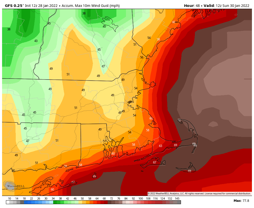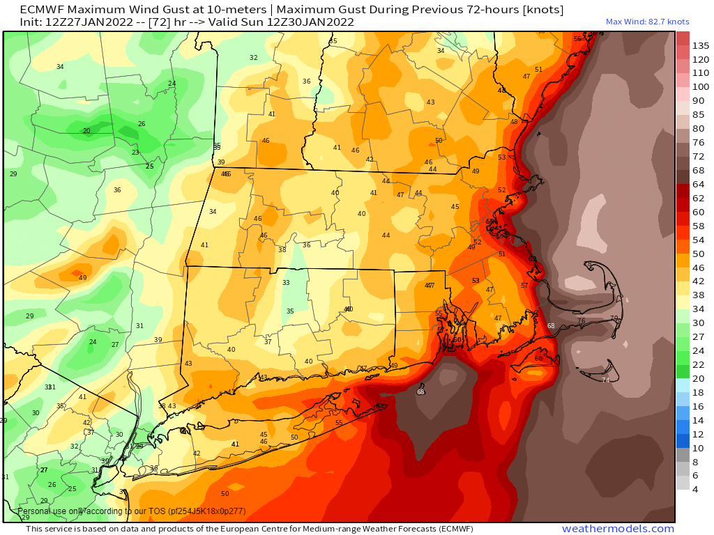 OK, let’s get to the details. We’ll start with temperatures. North and west of Boston, temperatures will likely be in the teens for much of the storm, resulting in a fluffy snow. This will make cleanup easier, but also make it easier for accumulations to pile up quicker. South of Boston, temperatures will be in the 20s to start, but will drop during the day, so we’re also looking at a fluffier snow here as well. Across Cape Cod, temperatures will be closer to freezing, so it’ll be a wetter snow, with the possibility of rain mixing in, depending on how close the storm actually tracks. The general rule is that 1 inch of liquid equals about 10 inches of snow, which works fine with temperatures close to freezing. The colder you get, the higher the ratio gets. When temperatures drop into the teens, the ratio can get to 20:1, which means 1 inch of liquid results in 20 inches of snow. We’re not sure it’ll get that high, as there are other factors involved beyond the temperature at the ground, but it is certainly possible. The other thing to keep in mind is that the temperatures, combined with strong winds (see next paragraph), will result in very cold wind chills, so keep this in mind if you’re heading outside to do some shoveling during the storm.