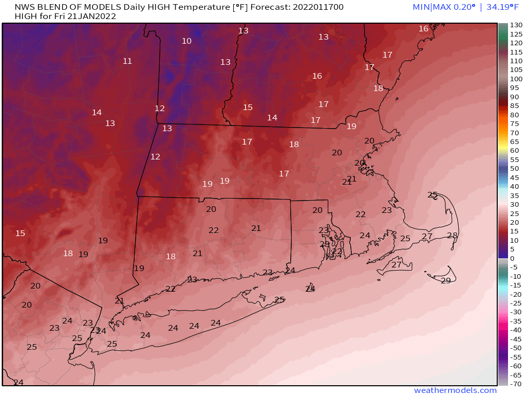 Another factor will be temperatures. We mentioned that this will be all snow for nearly all of the region, but it’s looking like it’ll be a fluffy snow for many of us. This is both good and bad. It’s good, because it makes it a lot easier to clean up, but bad, because it allows the snow to pile up even faster. The reason it will be a fluffy snow is because it’s going to be quite chilly. Areas north and west of Boston may stay in the teens all day Saturday, with 20s from Boston southward. Add in the strong winds, and you’re looking at wind chills in the single numbers and below zero. Keep that in mind if you’re going to try and clean up the driveway a few times during the storm.