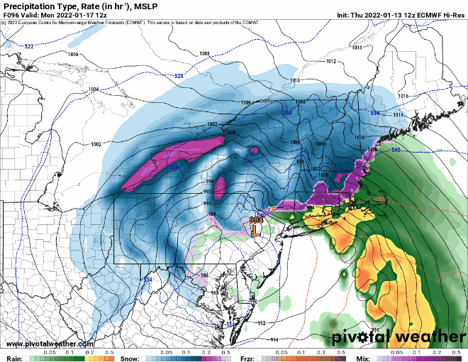 Winter Storm Watches are in effect for much of the coastal plain in the Northeast and Mid-Atlantic states. Image provided by Pivotal Weather.