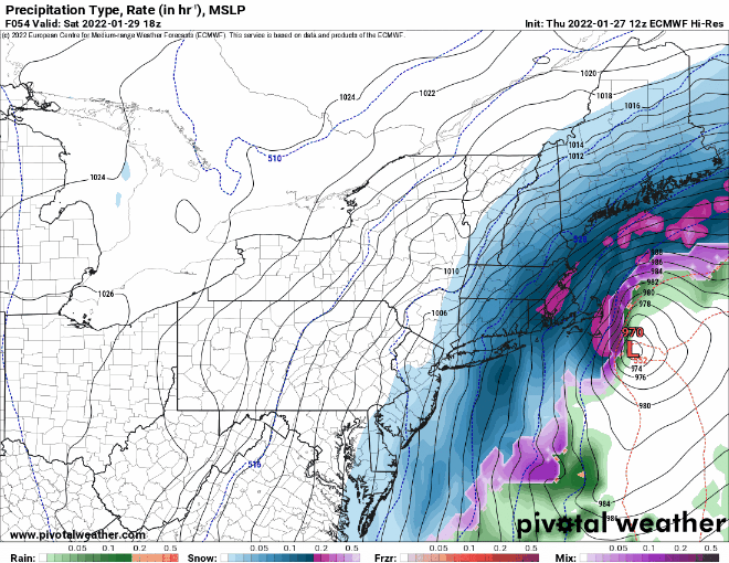 Blizzard Warnings are in effect from coastal Maine to the Delmarva Peninsula. Image provided by Pivotal Weather.