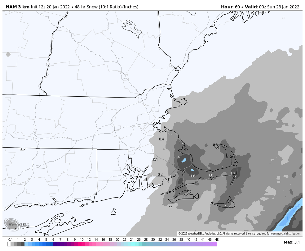 Central NH (Lebanon/Concord): 2-6″ Southern NH/Central MA (Manchester/Nashua/Fitchburg): 5-10″ Merrimack Valley/495 Belt/NH Seacoast (Portsmouth/Haverhill/Lowell/Framingham): 8-12″ I-95 corridor (Beverly/Boston/Providence): 10-15″ Southeastern MA/Cape Cod (Brockton/Plymouth/Taunton/Fall River): 12-18″ with some totals in excess of 20″ possible.