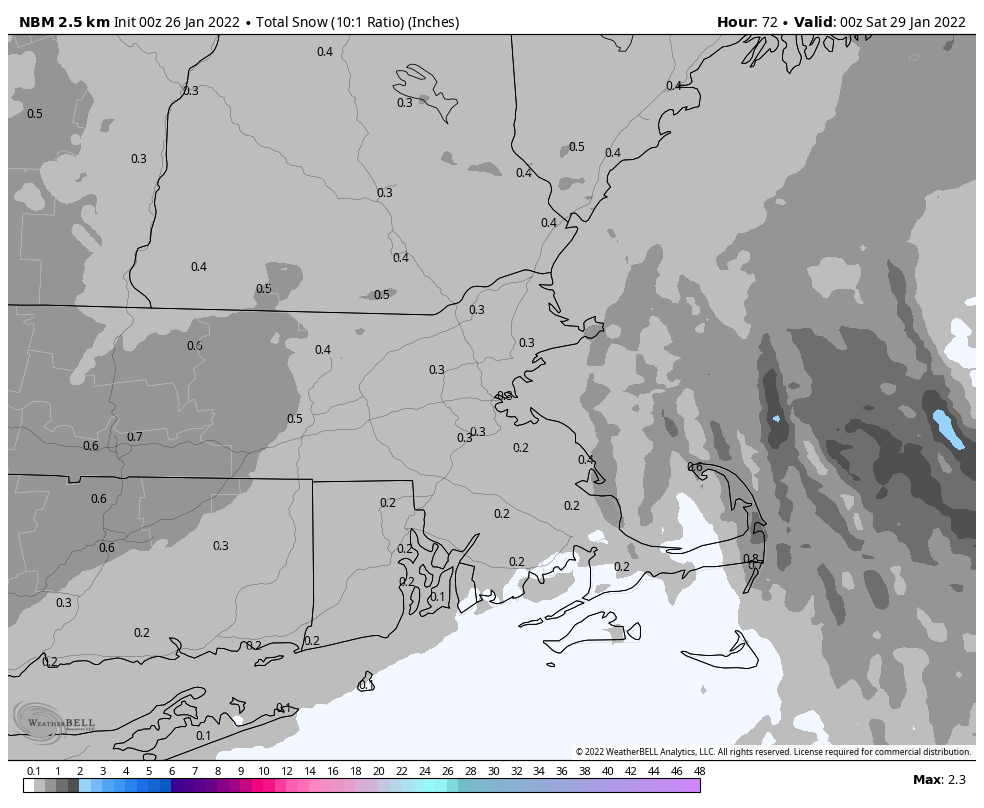 We’ll give you the general idea first, then get into specifics in the next paragraph or four. Low pressure will move up the East Coast Friday night and Saturday. There are still some questions as to exact track and strength, but we are narrowing the possibilities. At this point, it looks like the storm will track just south and east of Nantucket, which means that this will be all snow for everyone, except possibly Nantucket and the Outer Cape. The storm should pull away before daybreak Sunday, with clearing Sunday afternoon, then high pressure builds in with sunshine and colder weather on Monday.
