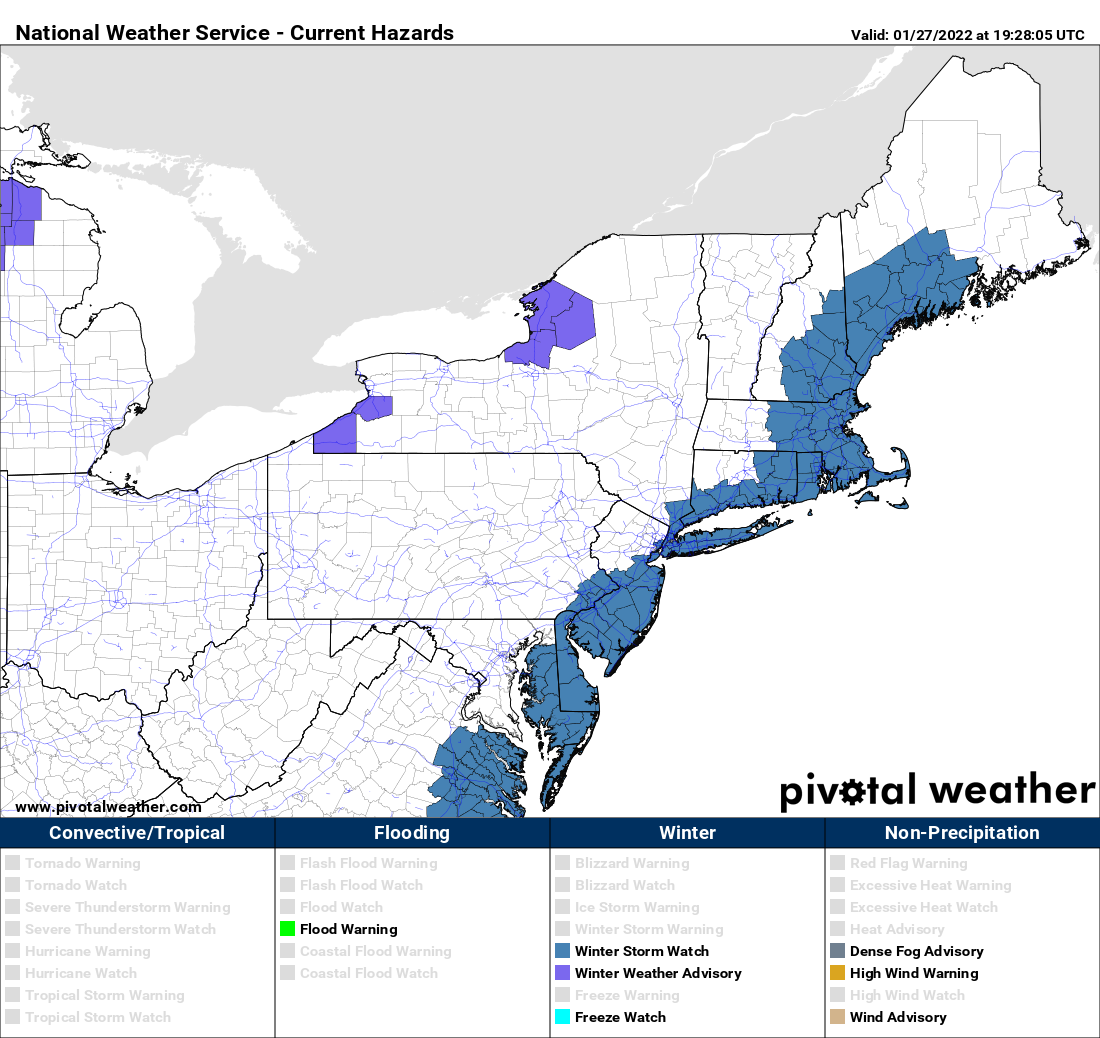 A variety of advisories and warnings are in effect across the Northeast. Image provided by Pivotal Weather.