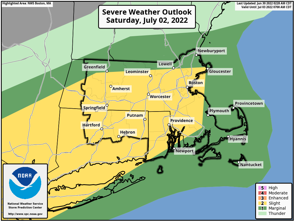 High pressure slides offshore tonight, resulting in hot and increasingly humid conditions on Friday. Temperatures will likely top 90 in much of the region. Humidity levels, while rising, won’t be in the unbearable range (yet), but you’ll definitely notice the increase in moisture. A warm front moves through at night, with a shower or thunderstorm possible, but all this front will really do is increase the humidity for Saturday. We’ll have more cloudcover on Saturday as a cold front approaches, but with a very warm and now very humid airmass in place, showers and thunderstorms are likely ahead of that cold front. Some of the storms that do form could be strong to severe, with strong winds, heavy downpours, and hail. If you’ve got outdoor plans Saturday afternoon/evening, keep an eye on the sky and the radar, and be prepared to move indoors.