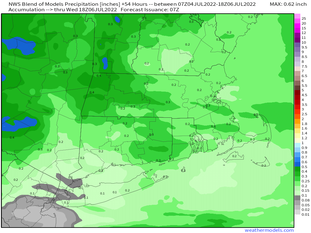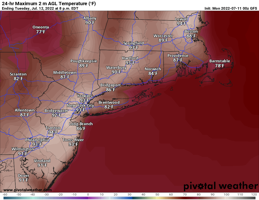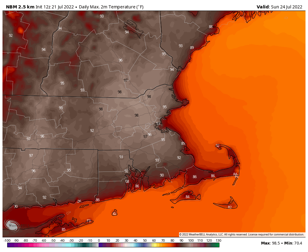 We’re actually starting the week off with some clouds, and possibly a few showers near the South Coast as a weak disturbance passes south of the region this morning. However, skies should clear out during the afternoon, with a warm and humid afternoon expected. Tuesday looks even warmer and more humid, but with a weak trough of low pressure moving through, we may see a few showers and thunderstorms develop during the afternoon. Wednesday looks to be another hot day, but it may not be quite as humid. Thursday certainly looks like the hottest day of this stretch, with some of the models are showing the potential for parts of the region to reach 100 degrees again on Thursday. We’re not quite sure it’ll be that hot, but some upper 90s are certainly plausible.