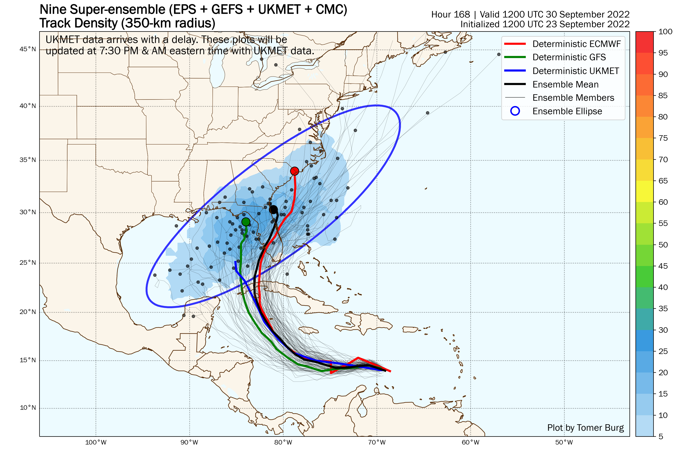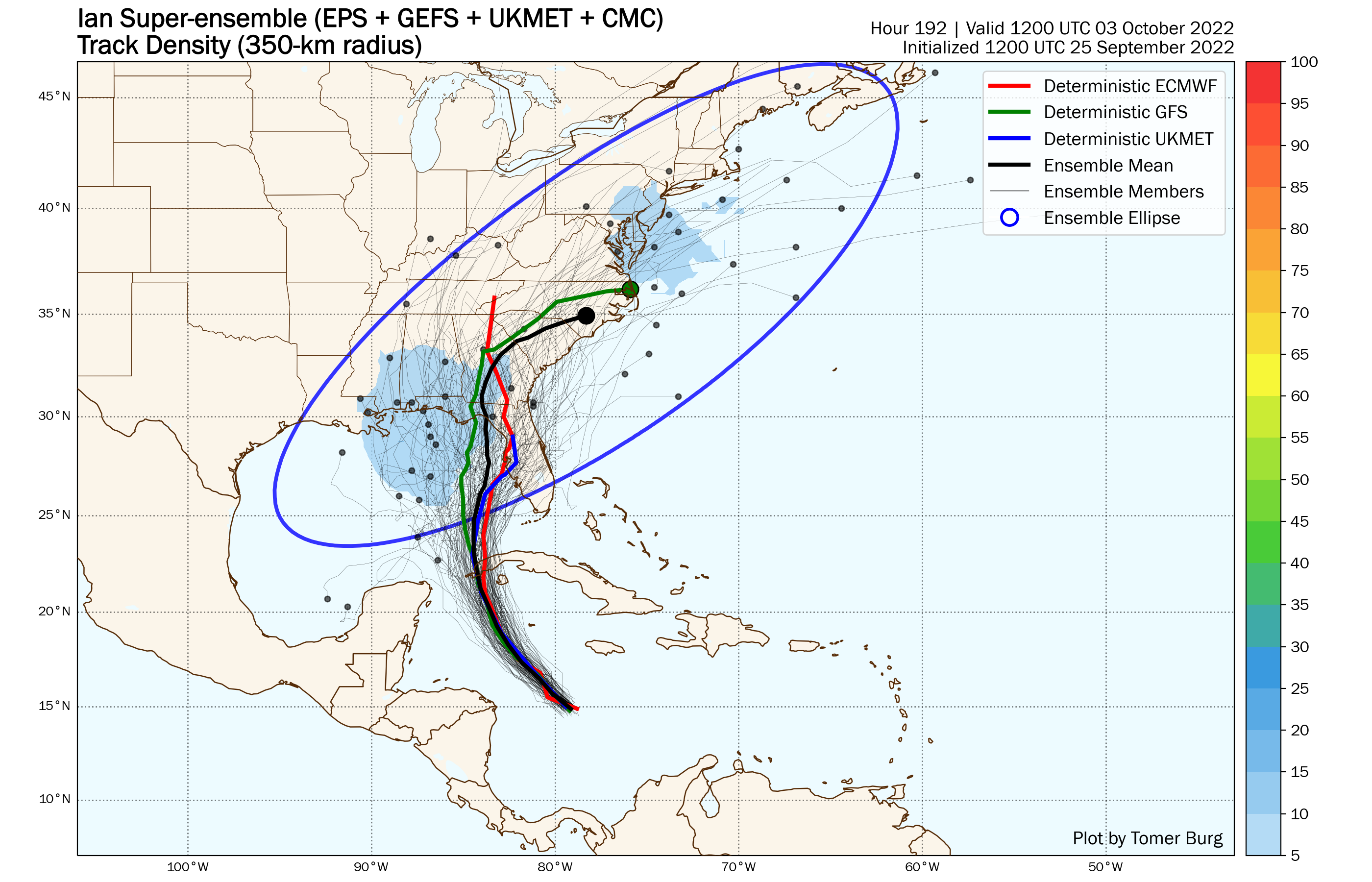 The members of the various ensembles show a wide range of tracks for Ian as you get out to next weekend. Image provided by Tomer Burg.