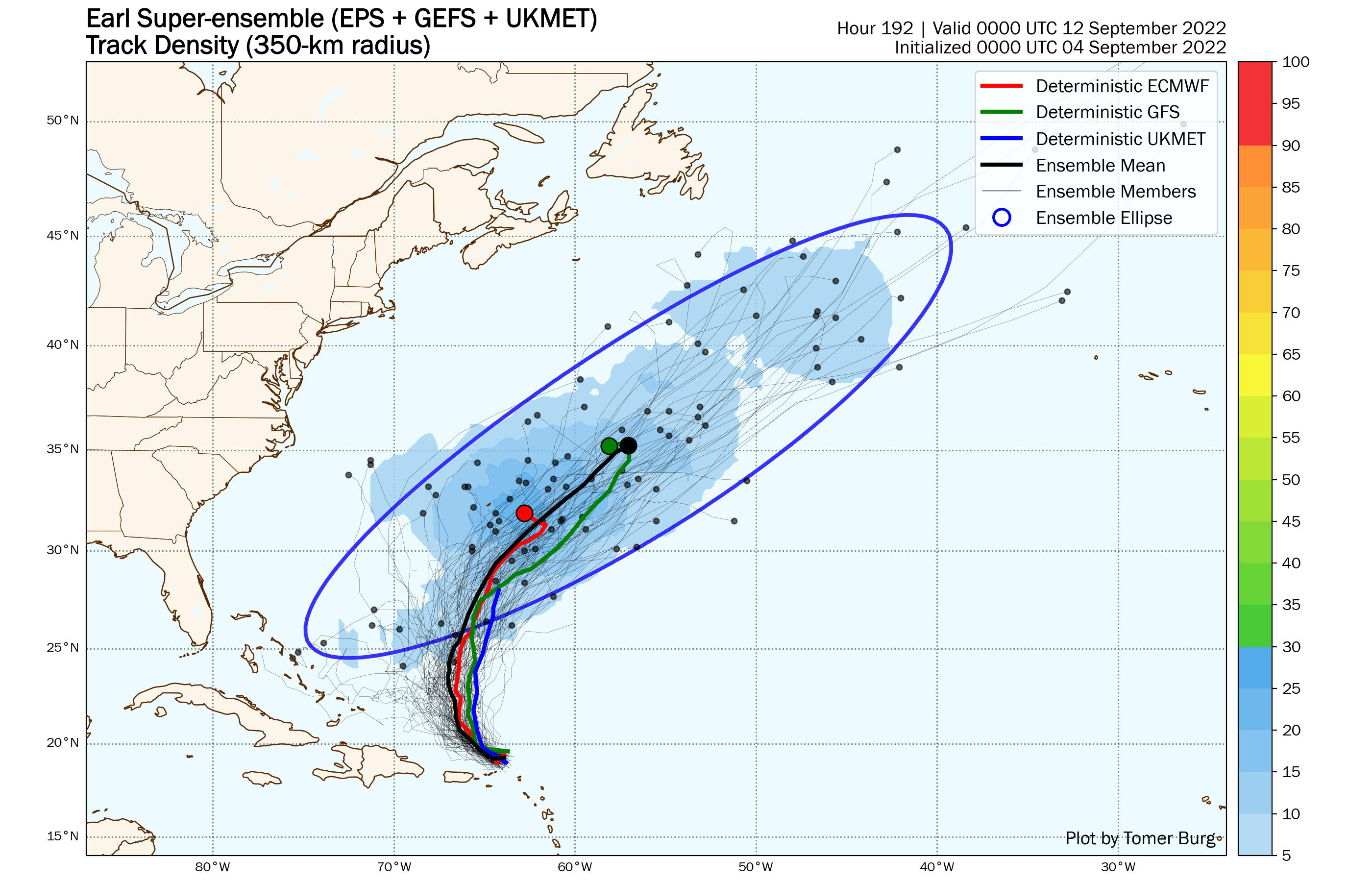Most of the various ensemble members show an out to sea track for Earl, but there are a few that threat Bermuda. Iage provided by Tomer Burg.