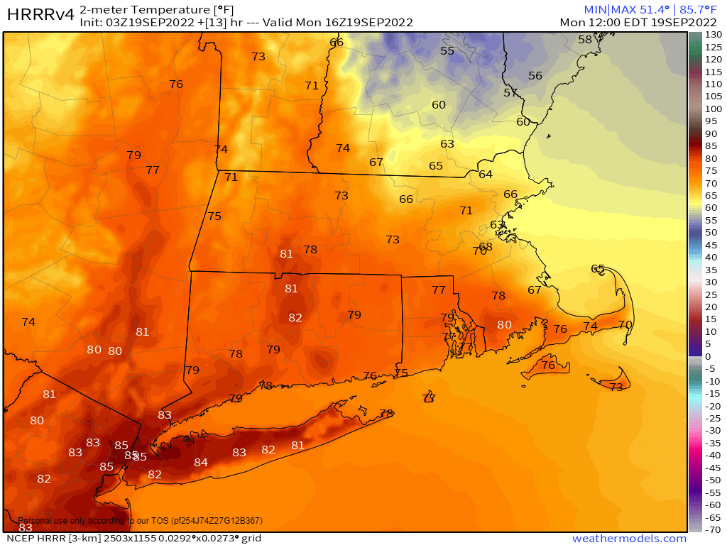 Temperatures at midday may range from near 60 along the NH Seacoast to near 80 along the South Coast. Image provided by Weathermodels.com
