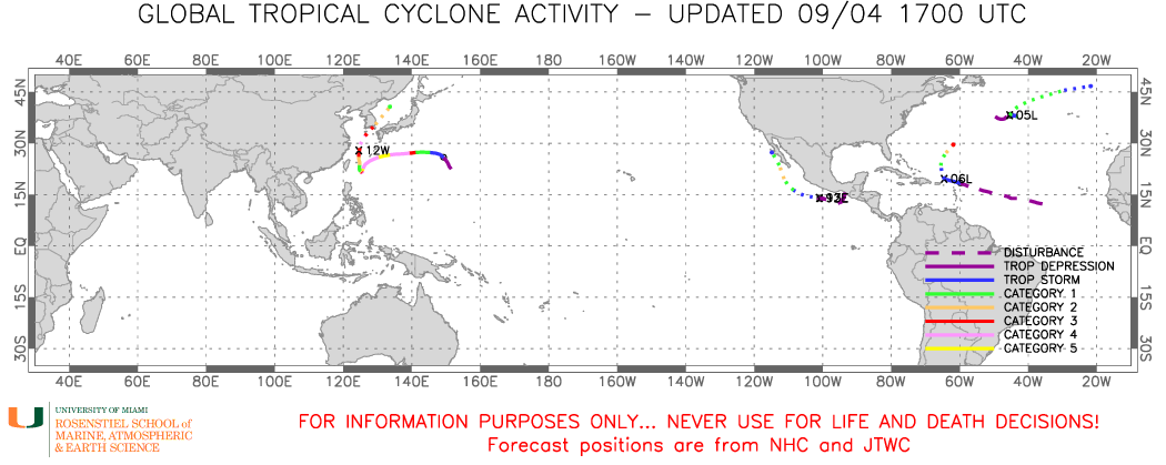 There are now 4 active tropical cyclones around the world. Image provided by Brian McNoldy, University of Miami, Rosenstiel School.