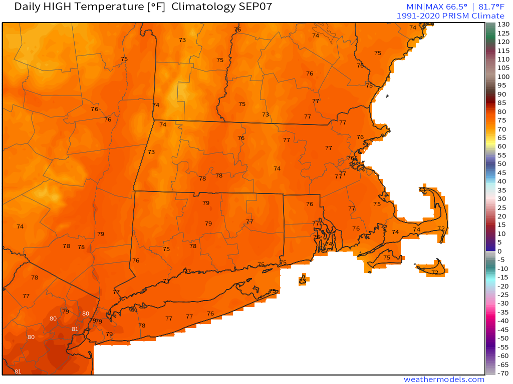 Normal high temperatures for early September are in the middle to upper 70s across the region. Image provided by Weathermodels.com
