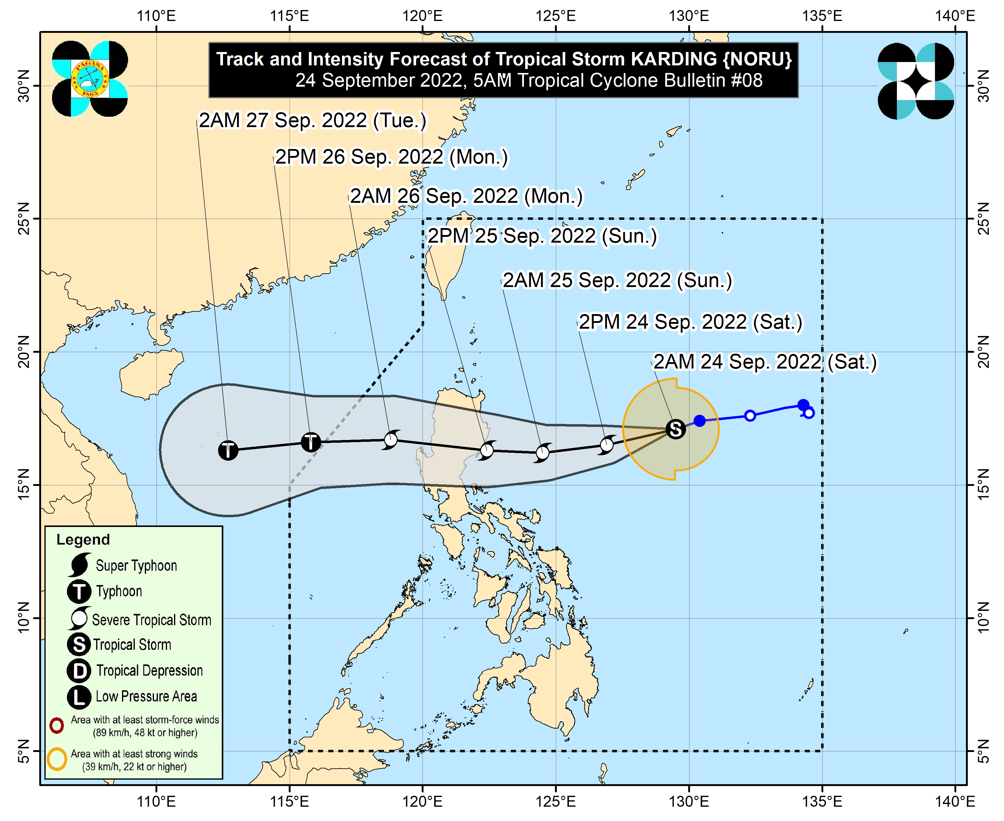 Forecast track for Tropical Storm Noru. Image provided by the Philippine Atmospheric, Geophysical, and Astronomical Services Administration.