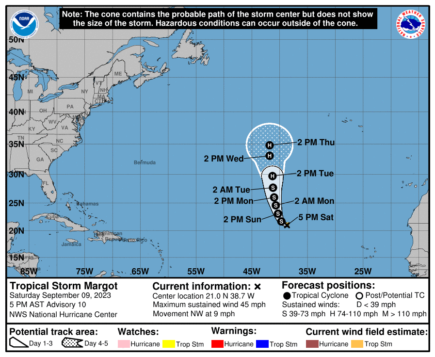 Forecast track for Tropical Storm Margot. Image provided by the National Hurricane Center.